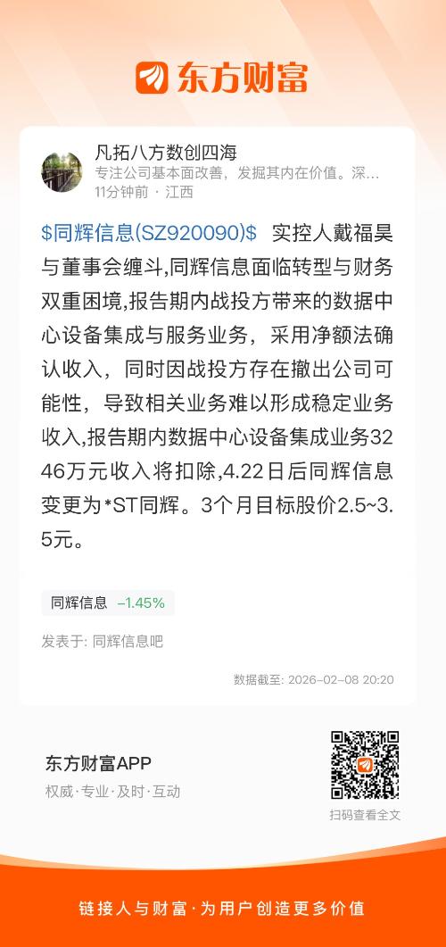 $同辉信息(SZ920090)$ 实控人戴福昊与董事会缠斗,同辉信息面临转型与财务双重困境,报告期内战投方带来的数据中心设备集成与服务业务,采用净额法确认收入,同时因战投方存在撤出公司可能性,导致相关业务难以形成稳定业务收入,报告期内数据中心设备集成业务3246万元收入将扣除,4.22日后同辉信息变更为*ST同辉。3个月目标股价2.5~3.5元。
