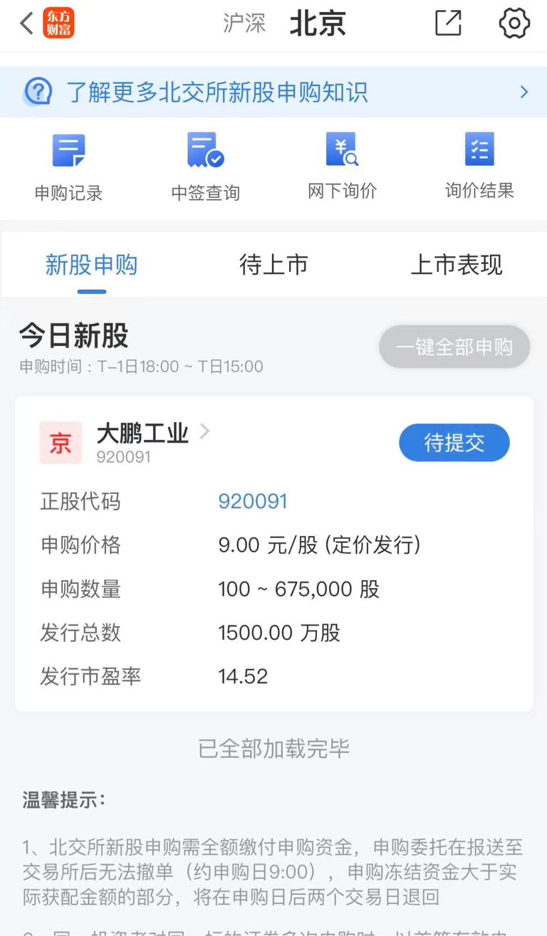 东财账户可以在前一天18:00之后,使用"预约打新"功能,提交申报。23:00多将显示申报状态为"未报",并冻结打新资金,存入券商服务器,待第二天9:15整第一时间报入交易所系统。
