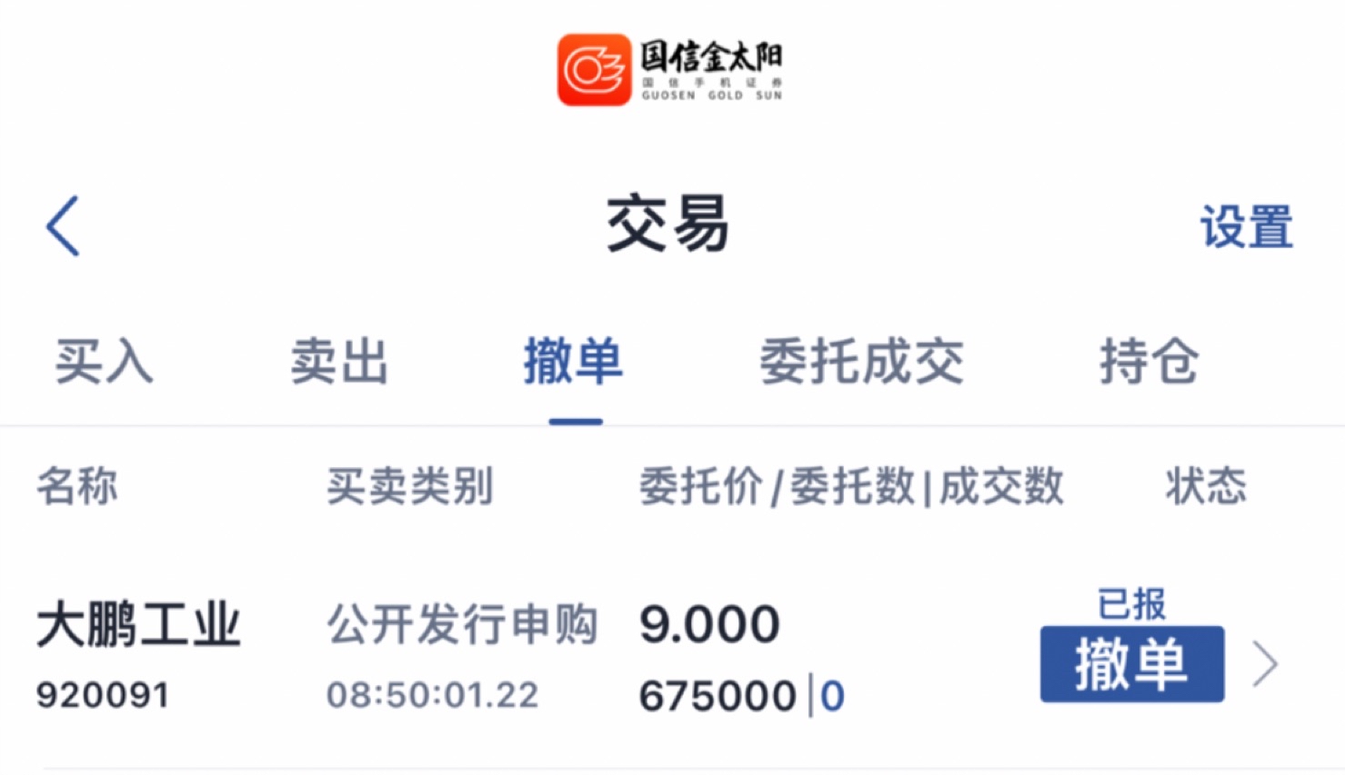 $大鹏工业(SZ920091)$ 国信证券手工下单绝对没有比我早的,剩下就是拼券商系统速度了,中不了立刻换券商!