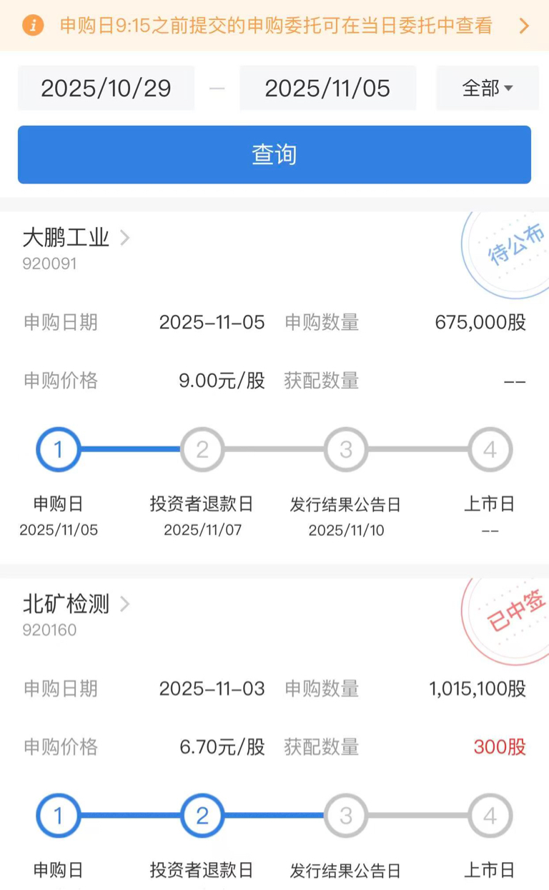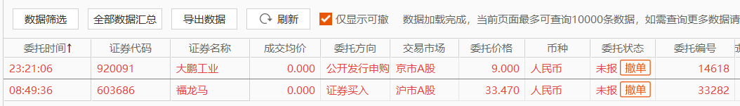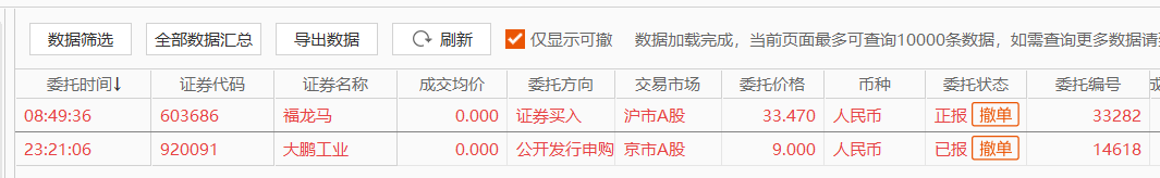 9:00整,提前单显示“已报”,其他买单显示“正报”,同时申购信息也已显示: