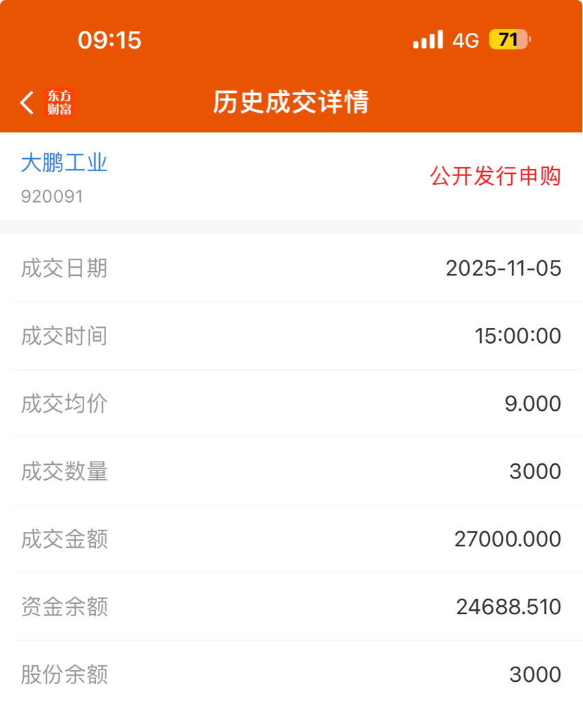 $大鹏工业(SZ920091)$ 帮我看看,我这个是不是中签了, 还是冻结资金,我想应该没那么容易中签,
