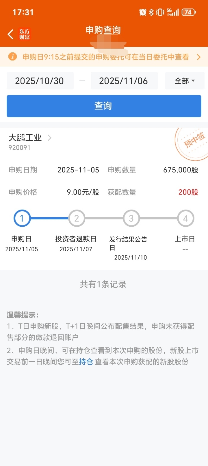 $大鹏工业(SZ920091)$ 早上8:33申购的,顶格200