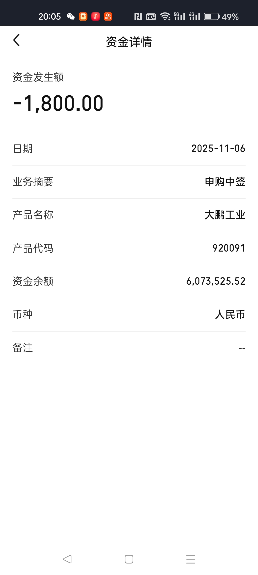 $大鹏工业(SZ920091)$ 华泰证券8.点50申购的200股,目前持仓看不到只能查资金明细。我妹子东吴证券9点申购的只有100股翻车!