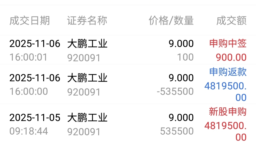 $大鹏工业(SZ920091)$ 目前看到最低中签是481.95W打535500股。还有没有更低的。
