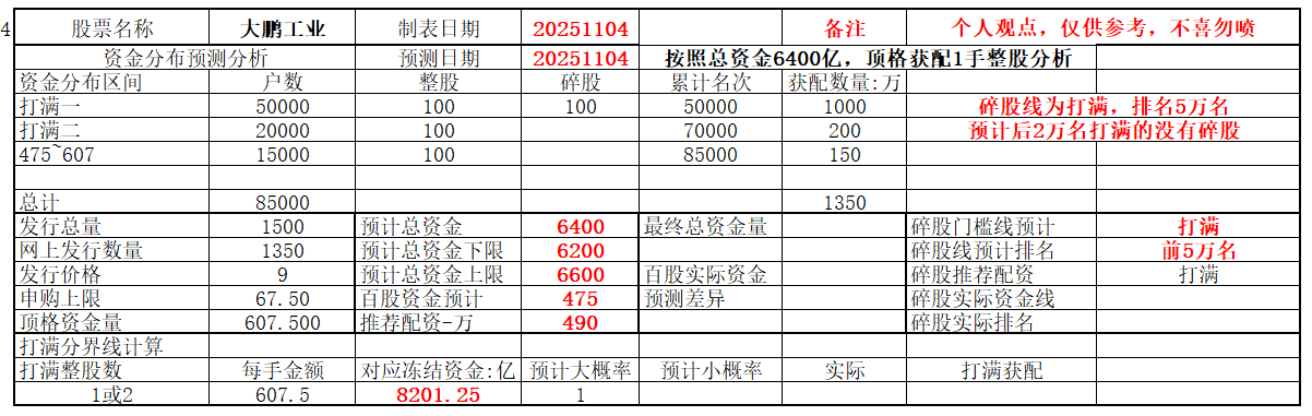 根据综合分析,目前预测大鹏工业的申购资金总量为6400亿左右,范围为6200-6600。测算的结果见附图。个人观点,百股需要资金475万元,建议490配资;碎股线为顶格的前5万名。本次预测最简单,全部是明牌,也不需要多解释,就算总资金预测有点偏差也不影响如何去打新配资。个人预测,仅供参考。有实力的还是需要多加,增加安全系数,我们需要安全上岸,而不是精准踩线,10次增加5%浪费的成本,远远比不上一次翻车的损失!!!。资金实力不允许的,在分界线附近的,自己尽力了就好!现在很卷,没有绝对的安全,只有概率高低,预测翻车也是正常的。不喜勿喷,口下留德,谢谢! 另外,本人在论坛原则上不帮忙分户或指导分户,抱歉!