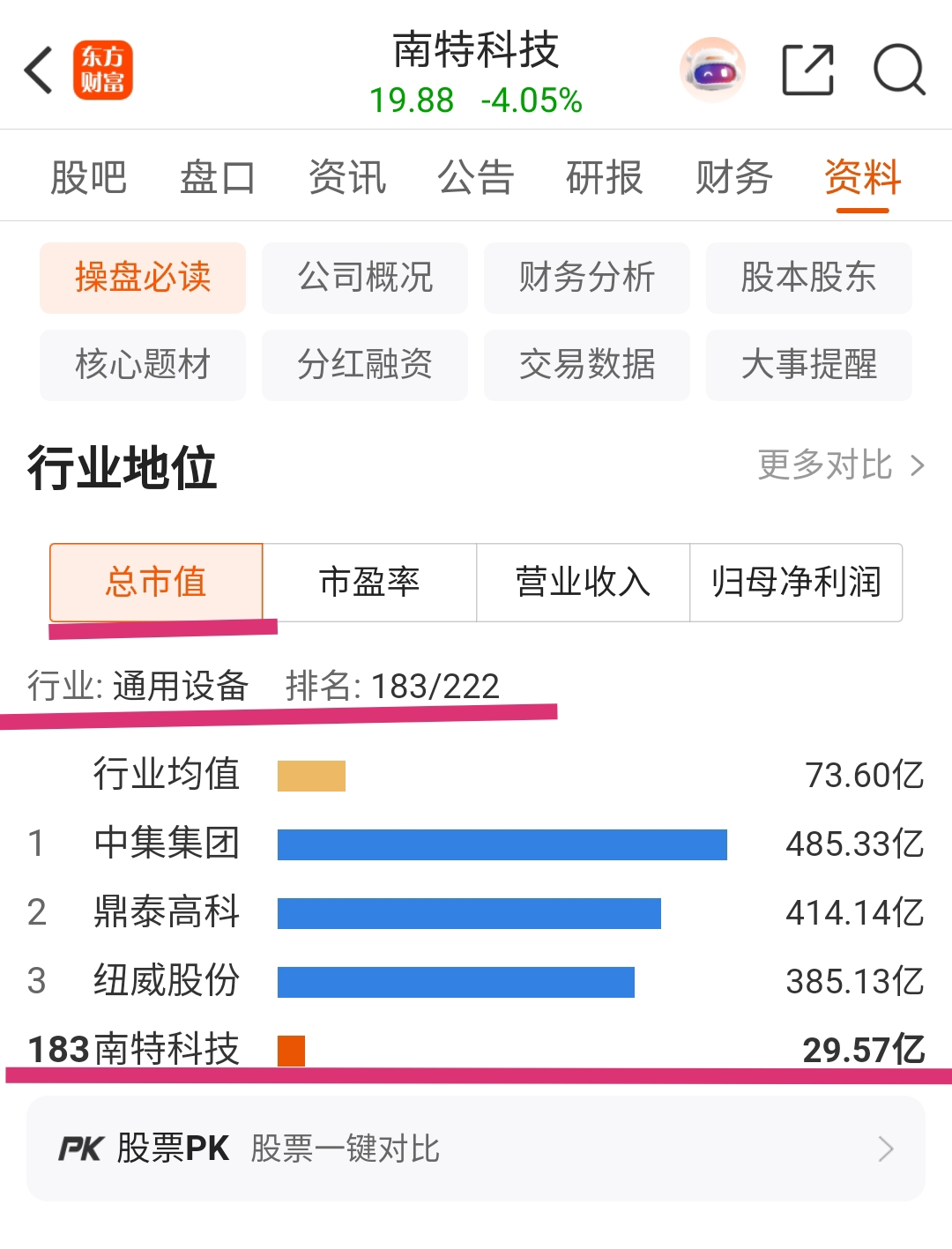 2025年12月1日南特科技总市值29.57亿元,行业排位为183/222(2025年12月1日收盘股价19.88元/股)。