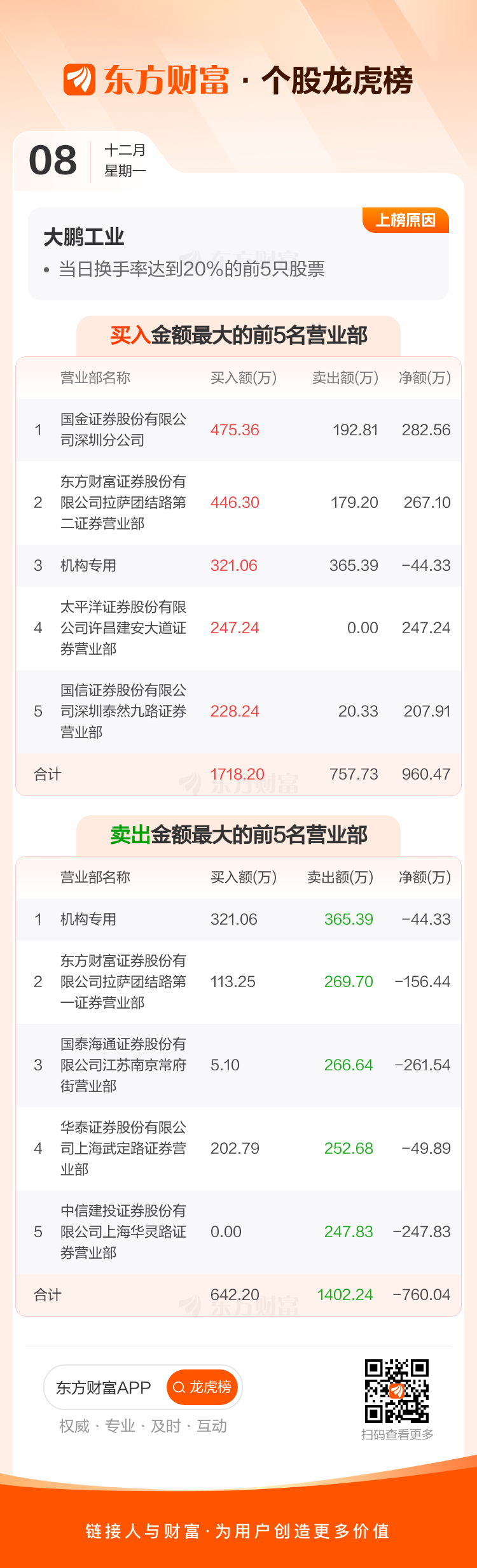 交易所2025年12月8日公布的交易公开信息显示,大鹏工业因成为当日换手率达到20%的前5只股票上榜。大鹏工业当日收报50.79元,涨跌幅1.58%,偏离值23.79%,换手率23.79%,成交额1.63亿。