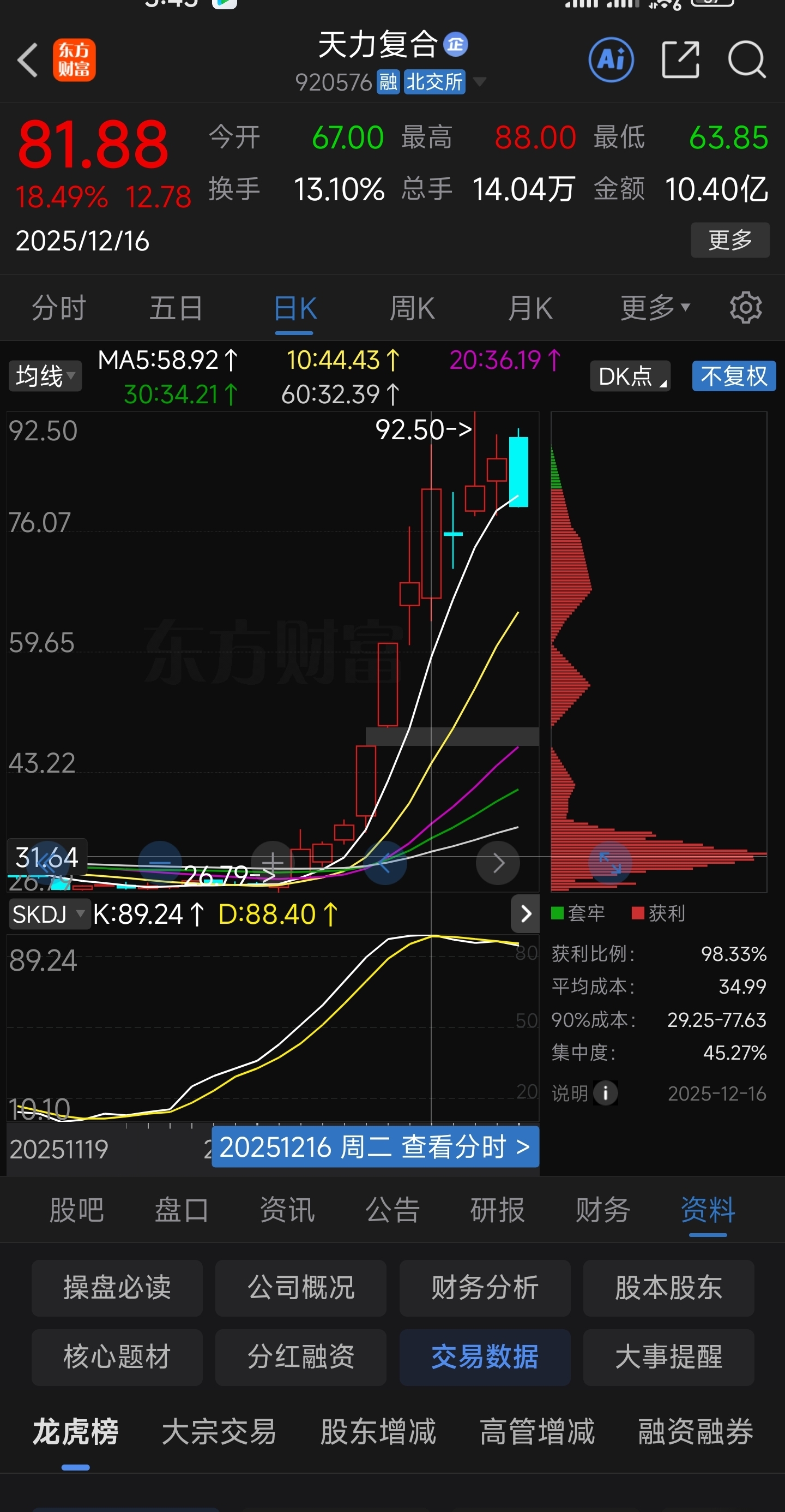 北交所家人们挺猛的,12月15日三家入天力复合,12月16日天力18%收,最高近板!