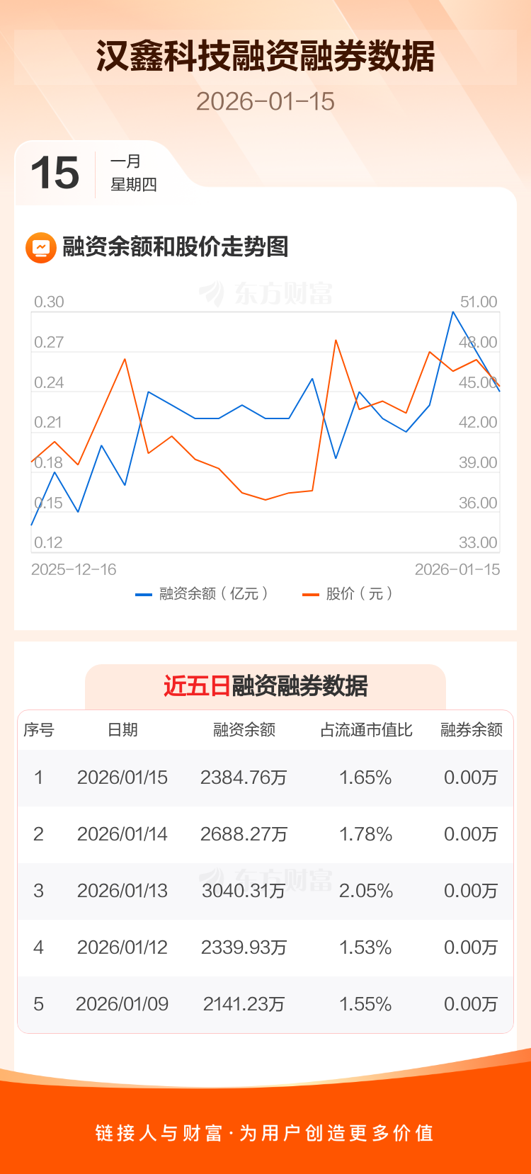 交易所最新数据显示,汉鑫科技于2026年1月15日获融资买入836.73万元,融资偿还1140.25万元,当日融资净偿还303.52万元。目前,该股融资余额2384.76万,占流通市值比例为1.65%。
