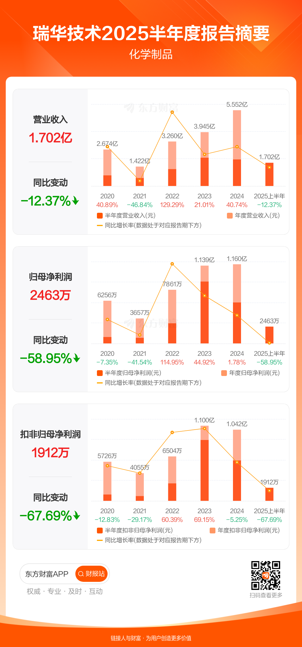 瑞华技术发布2025半年度报告显示,公司上半年实现营业收入1.70亿元,同比下滑12.37%;归母净利润2462.71万元,同比下滑58.95%;扣非归母净利润1912.43万元,同比下滑67.69%。