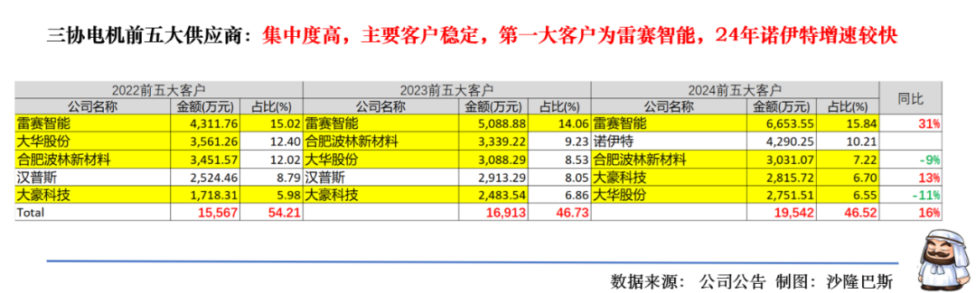 三协电机前5大客户比较稳定,分别为大华股份、大豪科技、合肥波林、雷赛智能、汉普斯。