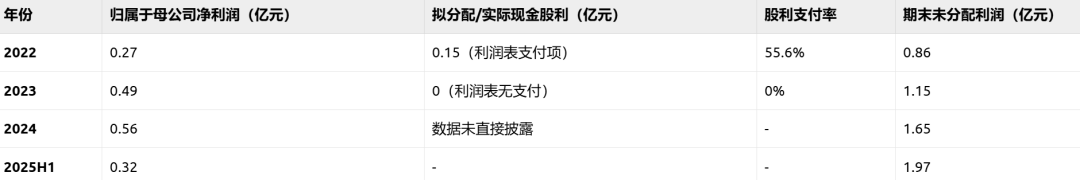 公司在2022年有过一次分红0.15亿元,分红率在55.6%,2023-2024年没有分红。未分配利润从2022年0.86亿元增至2025H1的1.97亿元,具备持续分红潜力。