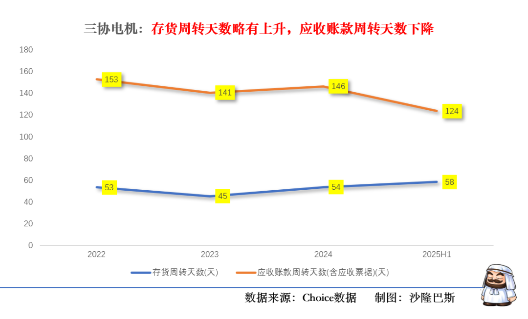 3.前五大供应商集中度中等,其中铁芯磁钢漆包线占比五成,主要原材料价格处于下降区间,24年存货大增,原材料加大备货,发出商品增加,存货周转天数略有上升,应收账款天数下降