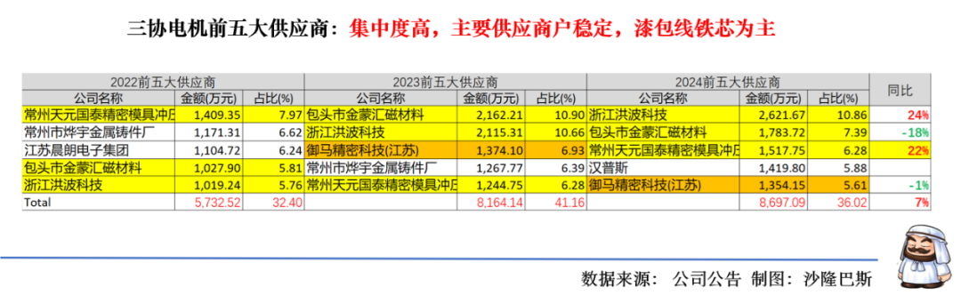 2024年公司的第一大供应商为浙江洪波科技,主要采购的为漆包线,2024年采购2621万元,同比增长24%,洪波科技连续三年为公司前五大客户。
