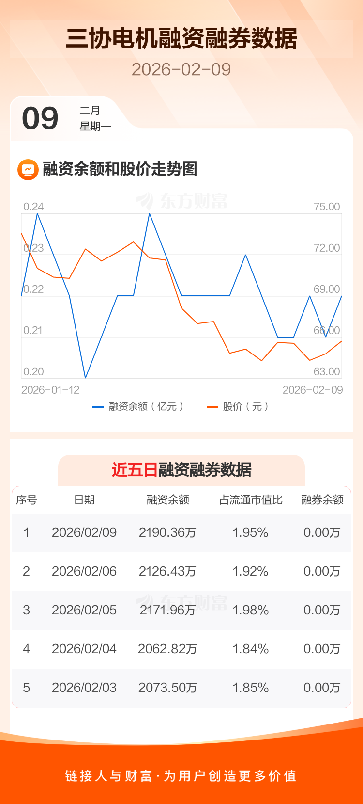 交易所最新数据显示,三协电机于2026年2月9日获融资买入199.79万元,融资偿还135.86万元,当日融资净买入63.93万元。目前,该股融资余额2190.36万,占流通市值比例为1.95%。