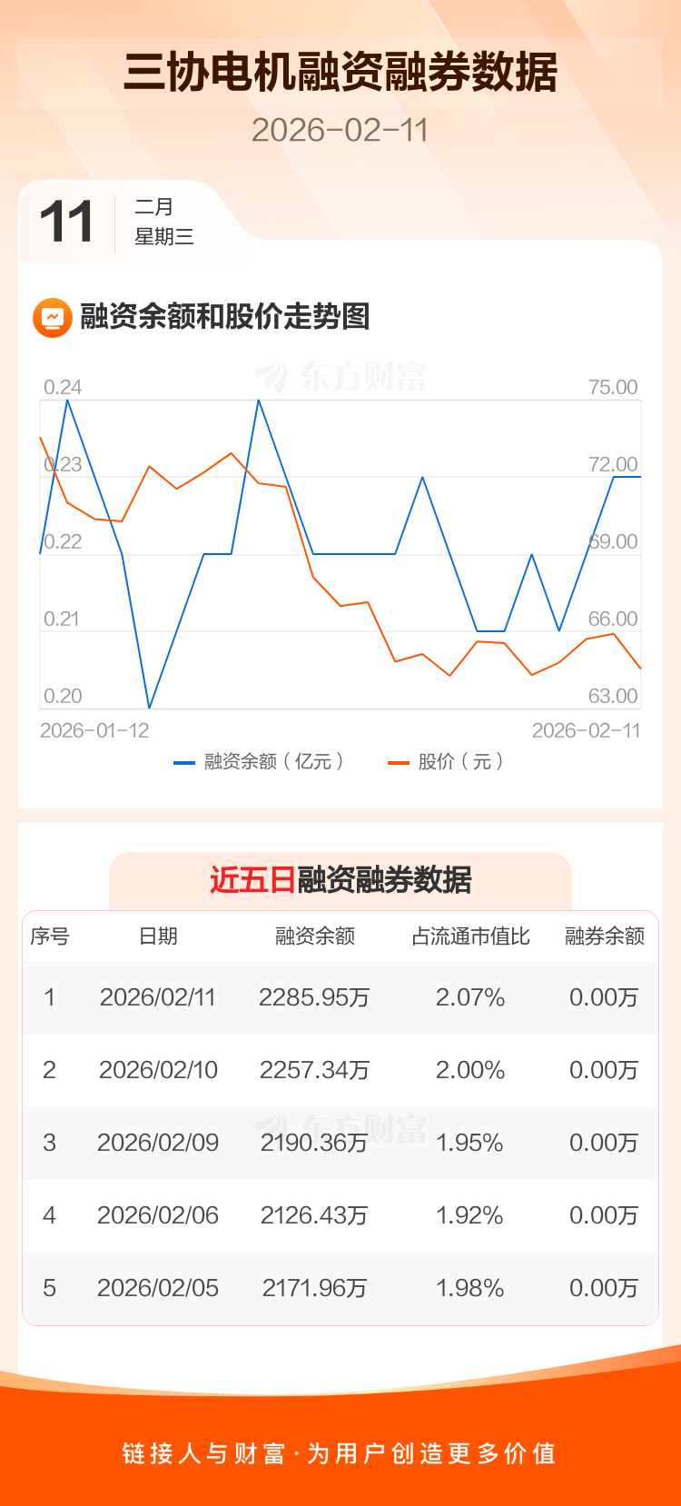 交易所最新数据显示,三协电机于2026年2月11日获融资买入223.11万元,融资偿还194.50万元,当日融资净买入28.61万元。目前,该股融资余额2285.95万,占流通市值比例为2.07%。