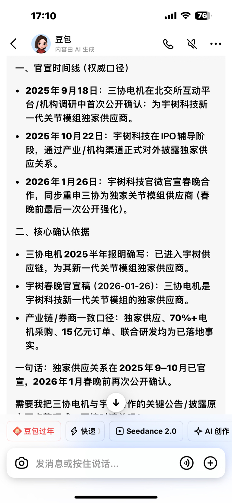 豆包这个骗子,竟然说三协是宇树机器人关节模组的独家供应商