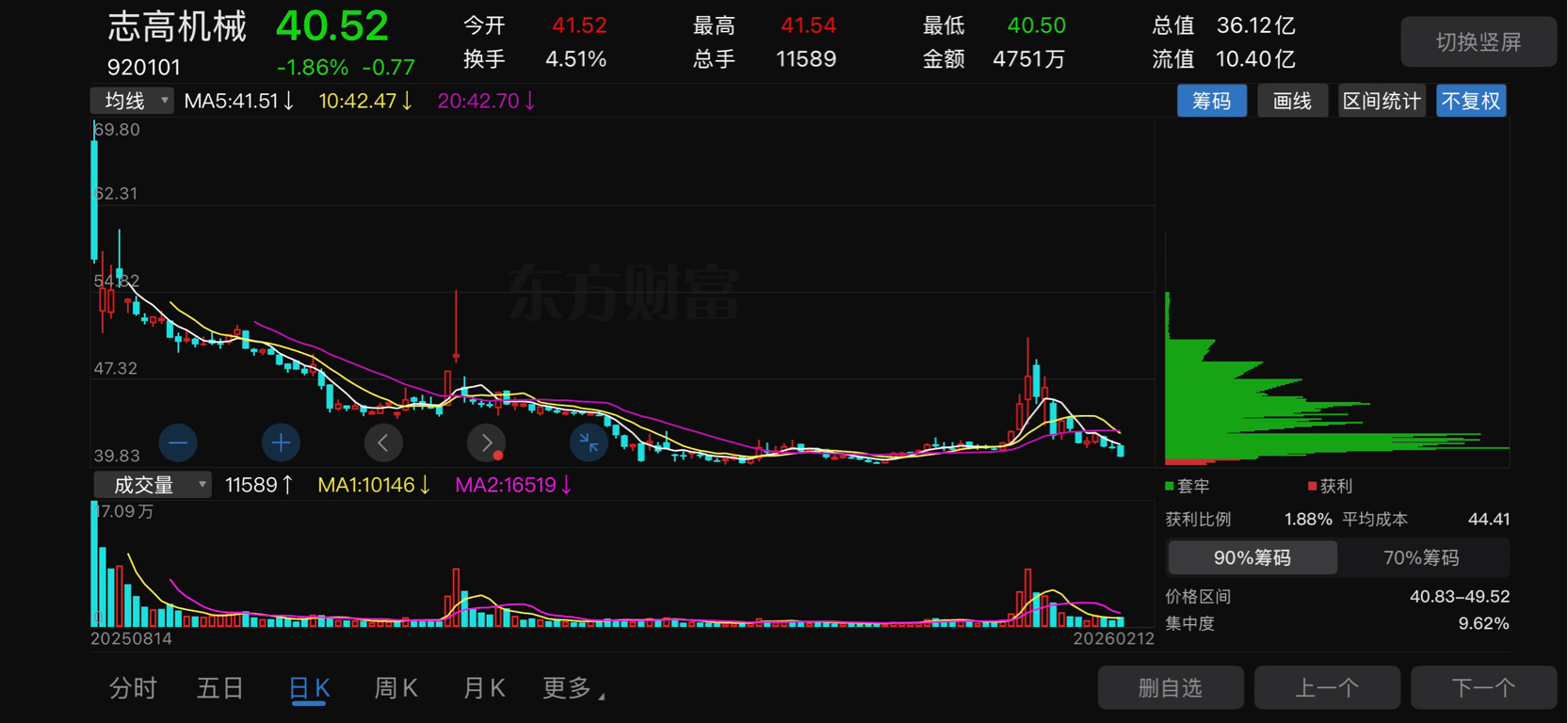$志高机械(SZ920101)$ 主力把自己也套牢了,尽是套年盘,没有获利盘,估计早期主力或原始股东在砸盘!可恶!