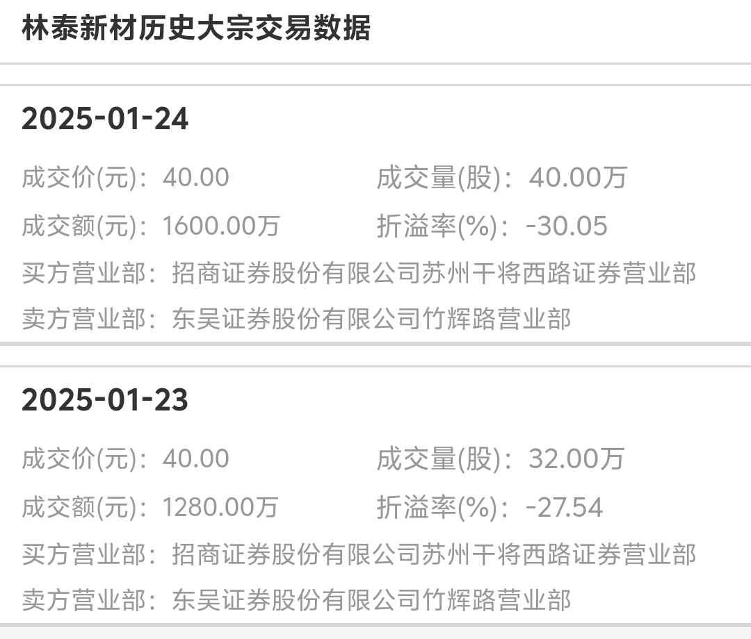 林泰连续两个交易日出现大宗交易,而且成交量还是很大的。