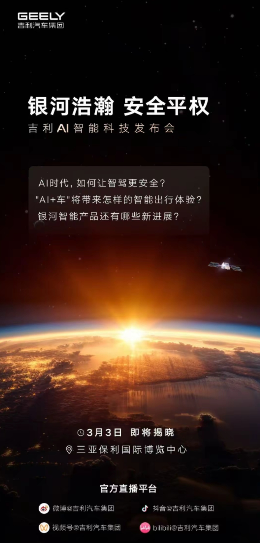 奇瑞3月18日举办智能之夜发布会,届时将展示猎鹰智驾、人形机器人、智舱大模型等最新成果。