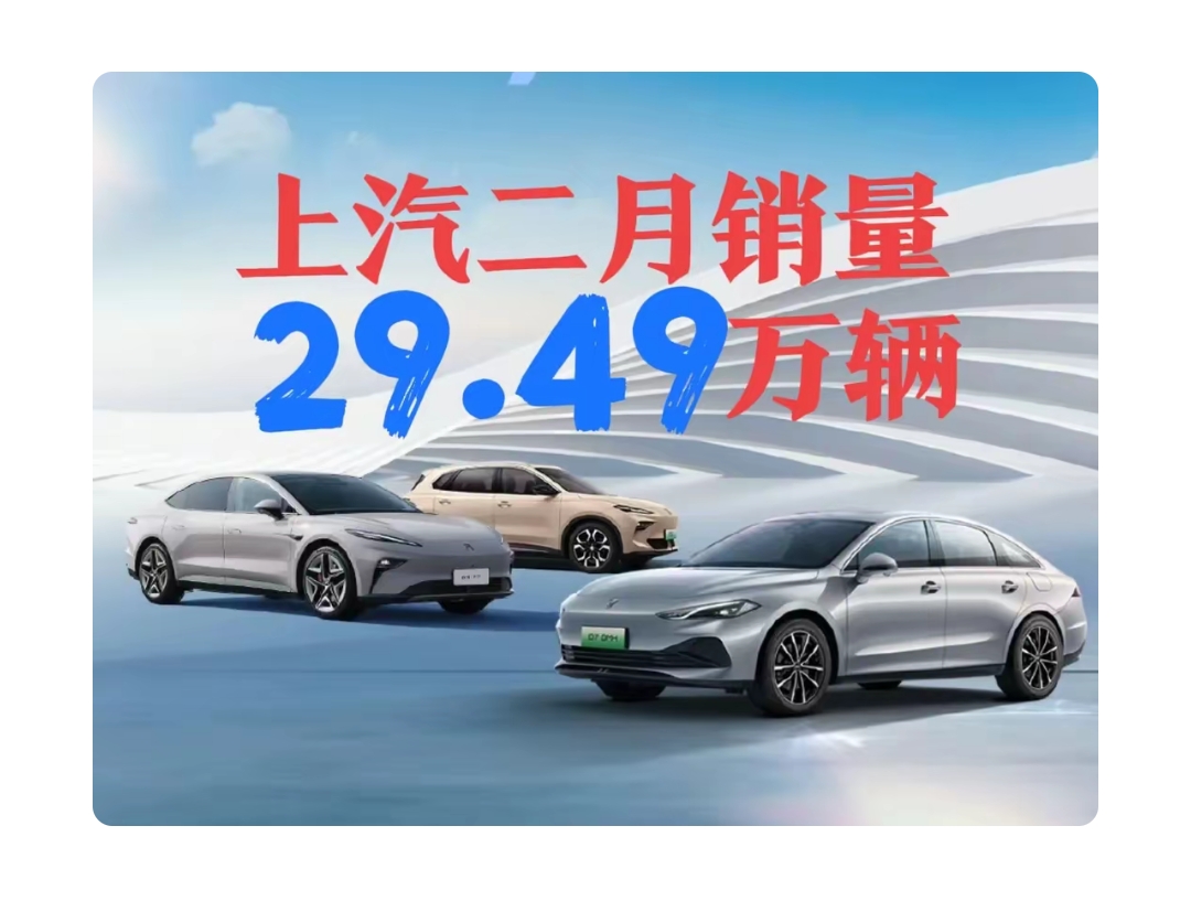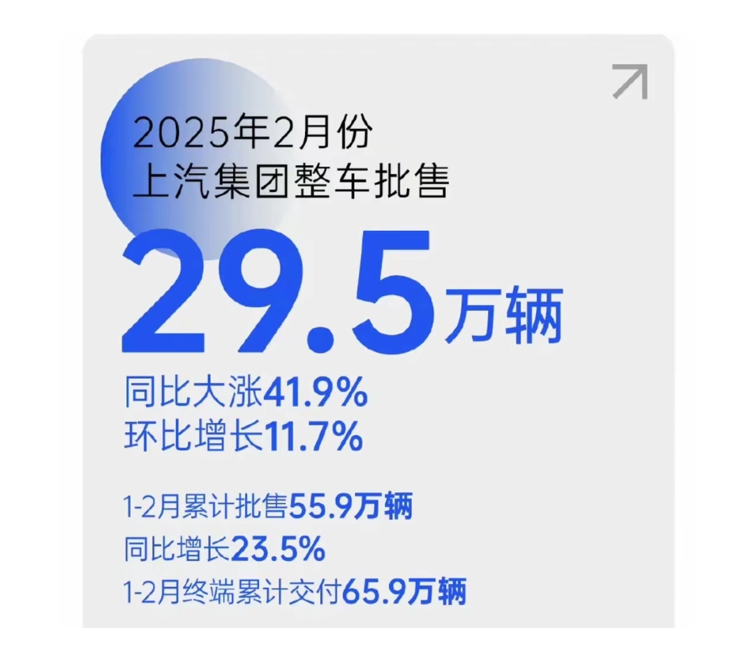 上汽集团发布2025年2月份产销快报,2月份批发销量29.49万辆,销量低于比亚迪,但高于吉利、奇瑞,且销量同比增长41.9%,成绩可谓相当优秀!