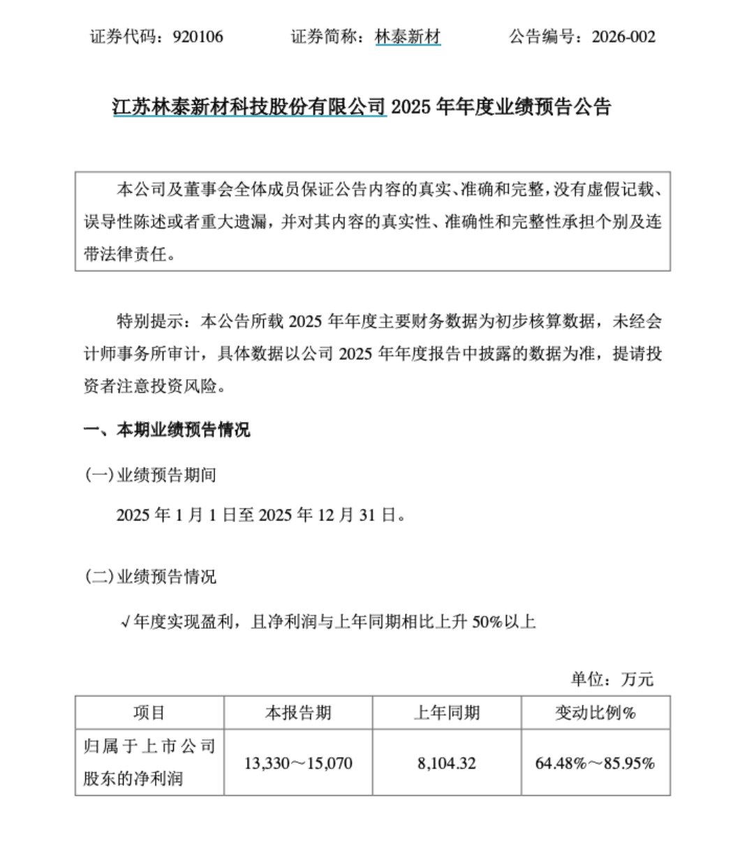 北交所2025年度首份业绩预告发布 林泰新材净利润同增超六成