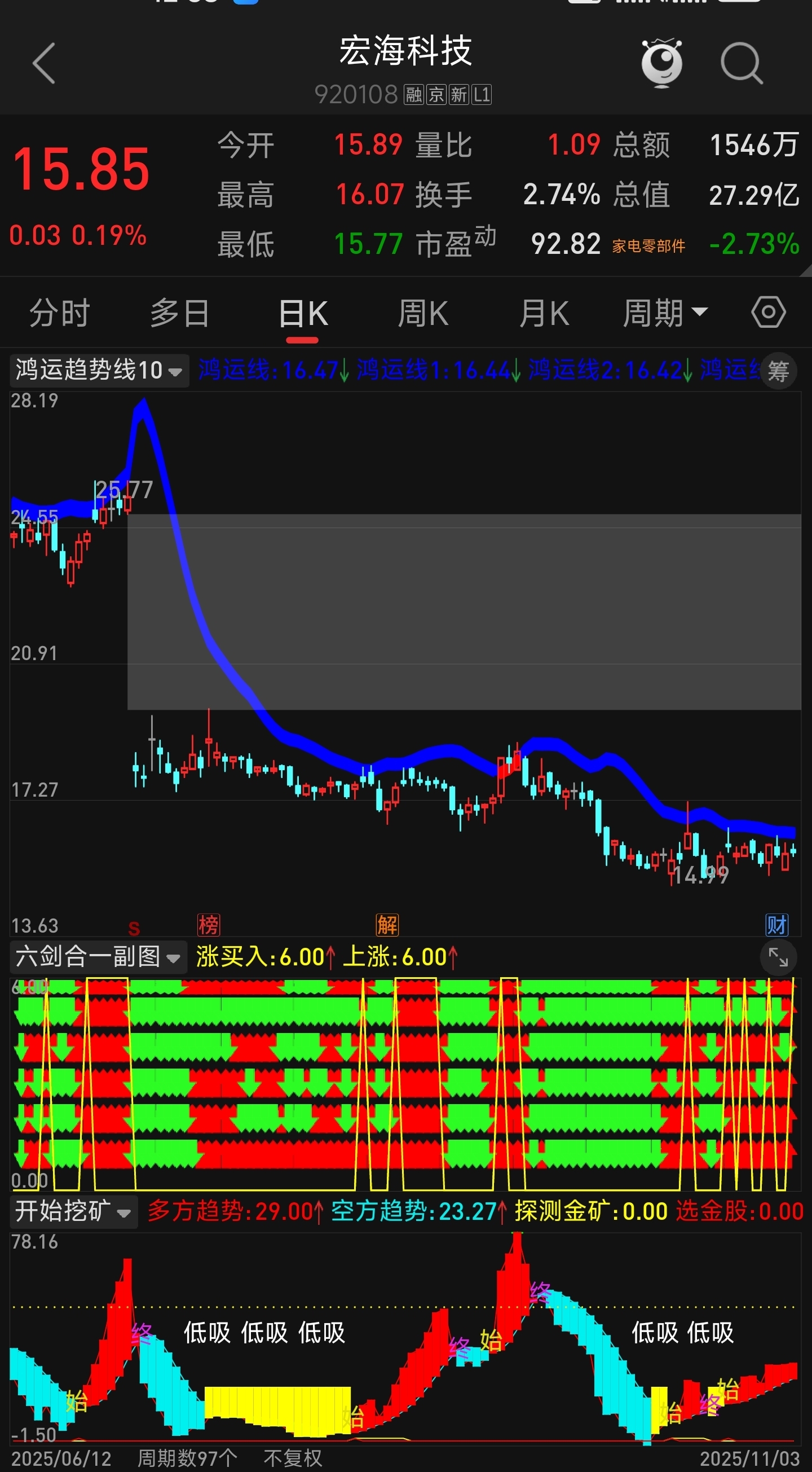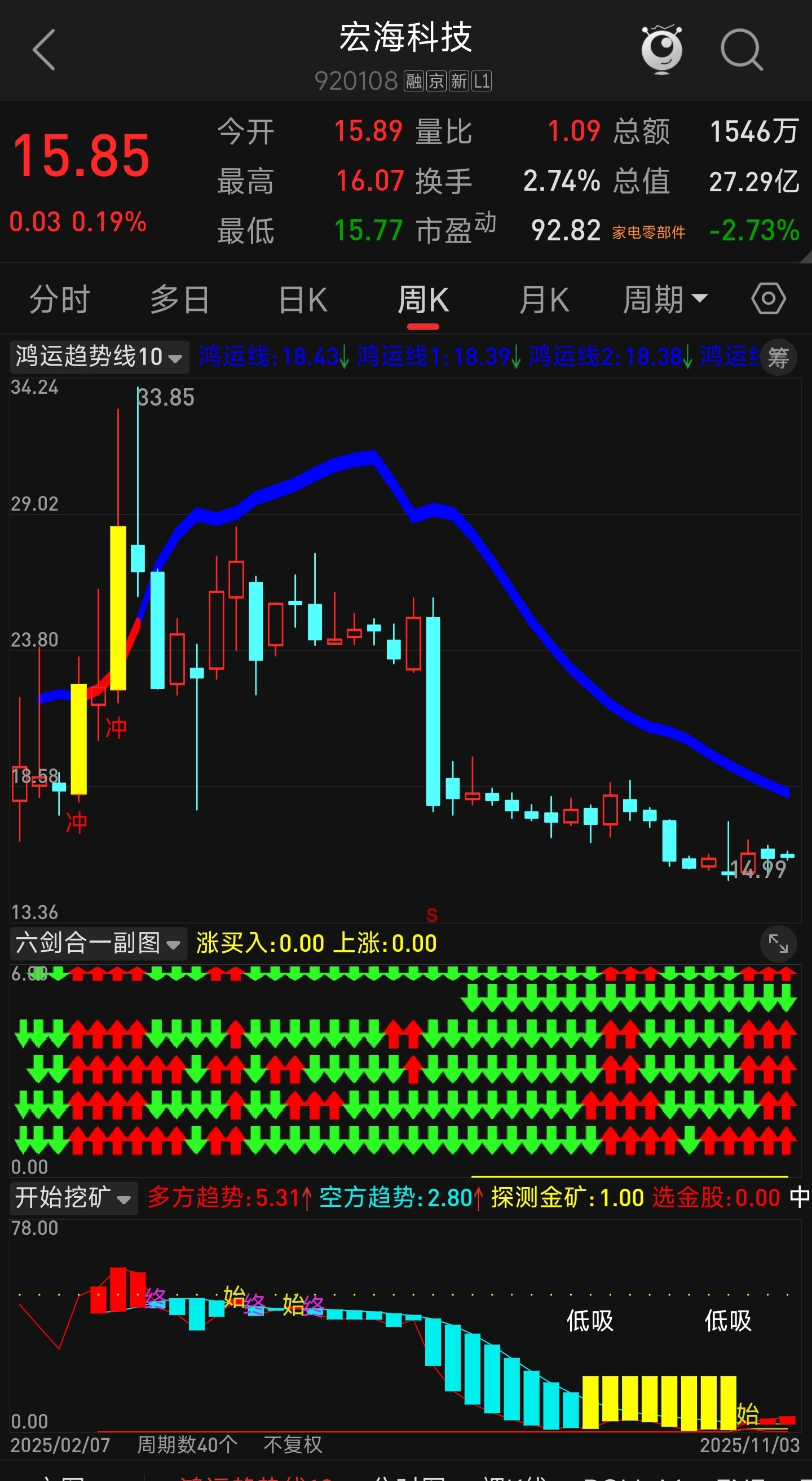 通达信给出宏海科技主力日线周线挖矿图,观多数强势股起飞前都有挖矿走势,宏海科技上
