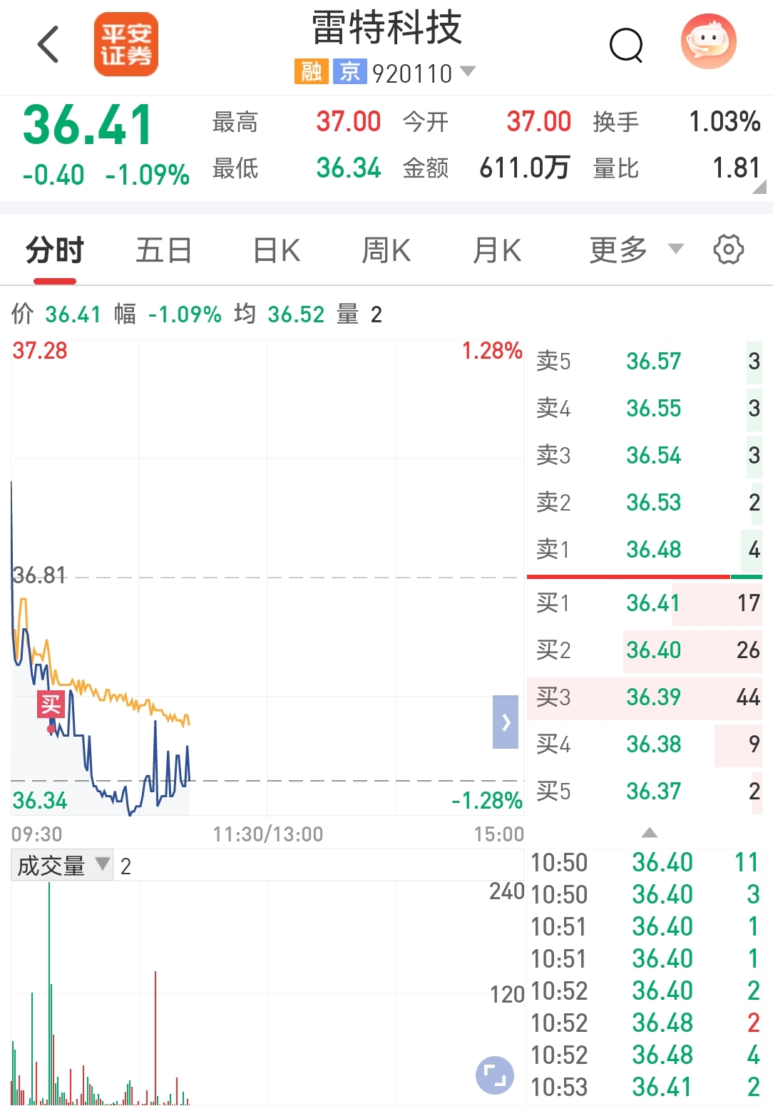 $雷特科技(SZ920110)$ 36.51加仓了100股,目前持仓400股,一百一百地加仓,等待放量上年线