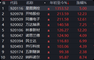 $星图测控(SZ920116)$ $开特股份(SZ920978)$ $同惠电子(SZ920509)$ 今年北证50成份股至今涨幅前十