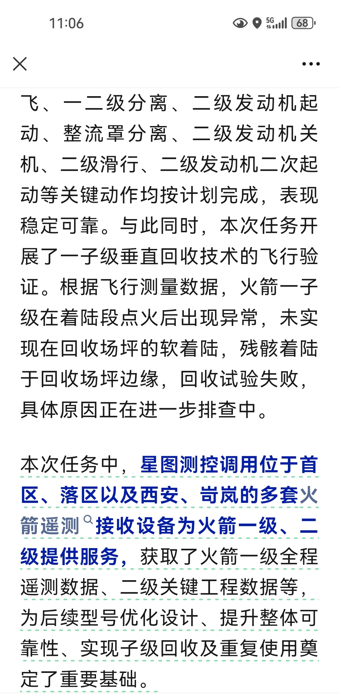 $星图测控(SZ920116)$ $航天机电(SH600151)$ $航天发展(SZ000547)$ 永远相信星图测控。本次任务中,星图测控调用位于首区、落区以及西安、岢岚的多套火箭遥测接收设备为火箭一级、二级提供服务,获取了火箭一级全程遥测数据、二级关键工程数据等,为后续型号优化设计、提升整体可靠性、实现子级回收及重复使用奠定了重要基础。