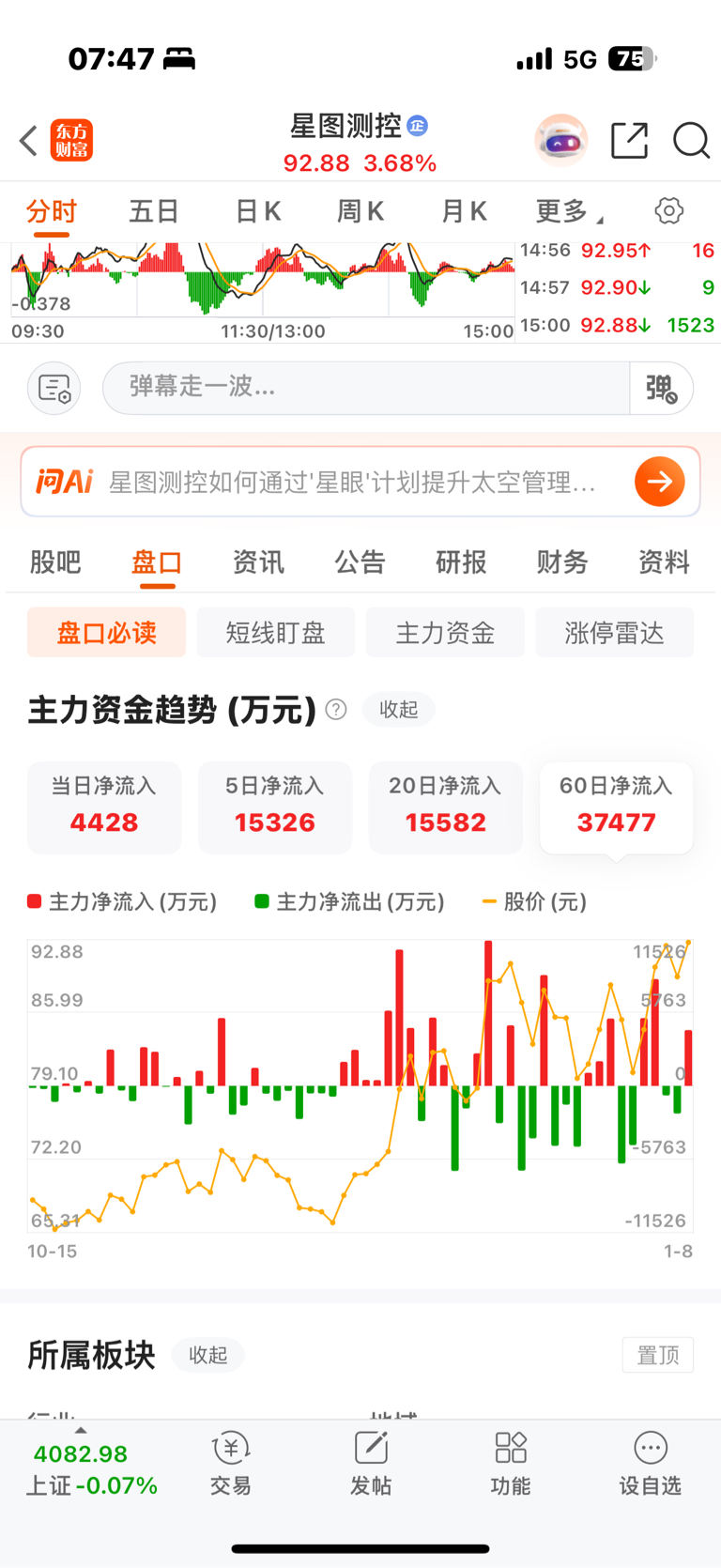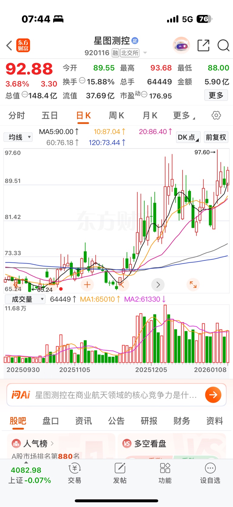 星图测控,这个日线走的漂亮了,也整理了一个月左右,就30多亿的流通票,足够把筹码都换一遍了,本人估计,星图即将出发,破100,拉30厘米大长腿。持股待涨!商业航天的后排中军在此,带领后排股走一波波澜壮阔的大行情!