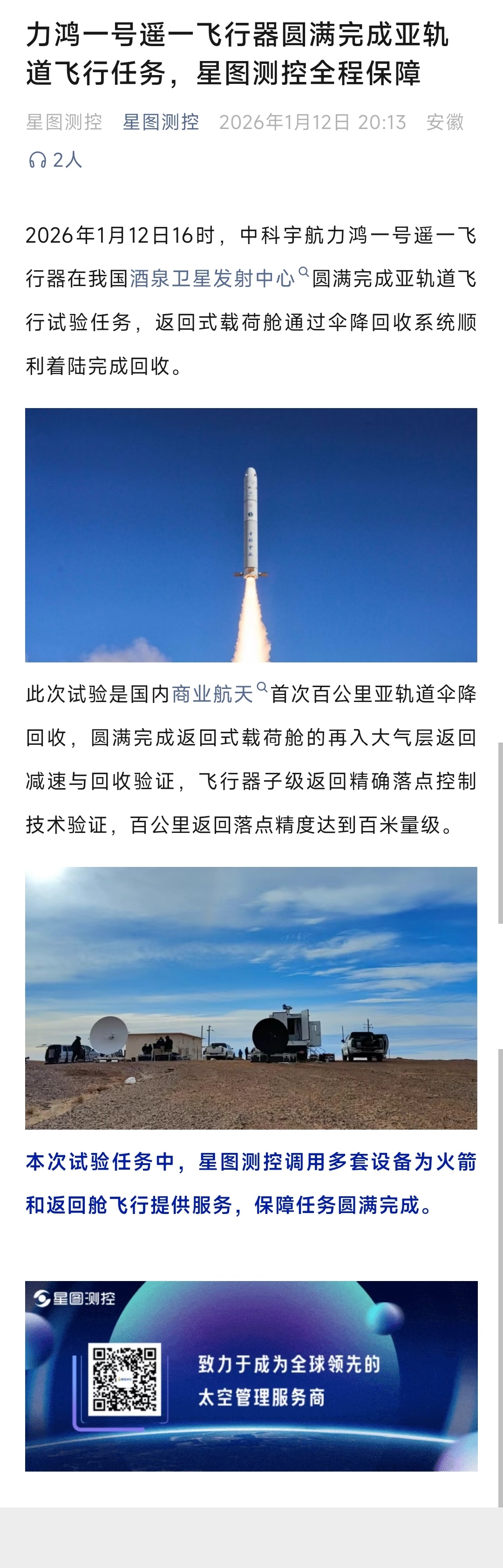 $星图测控(SZ920116)$ 力鸿一号遥一飞行器圆满完成亚轨道飞行任务,星图测控全程保障