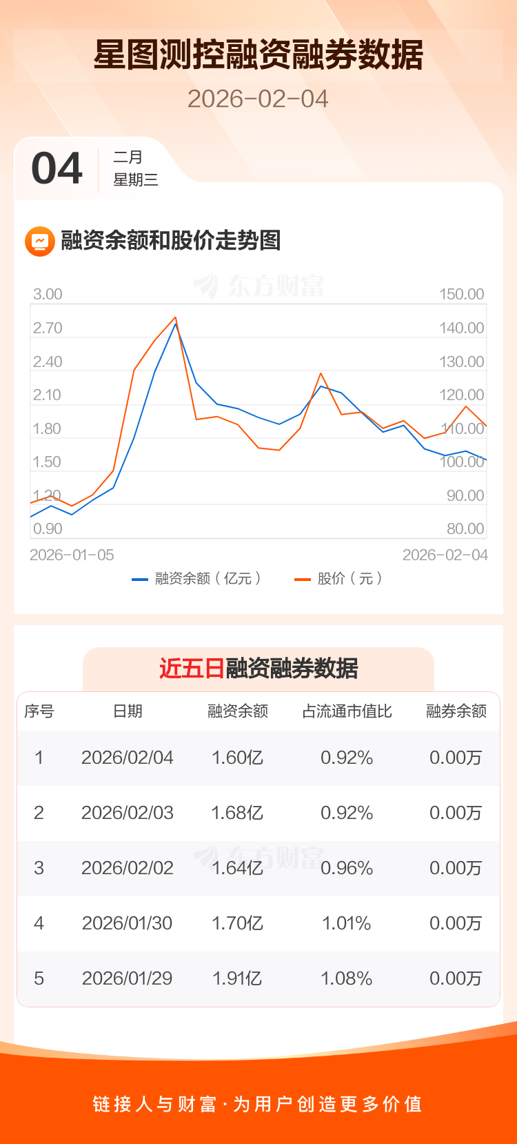 交易所最新数据显示,星图测控于2026年2月4日获融资买入2174.44万元,融资偿还2997.71万元,当日融资净偿还823.26万元。目前,该股融资余额1.60亿,占流通市值比例为0.92%。