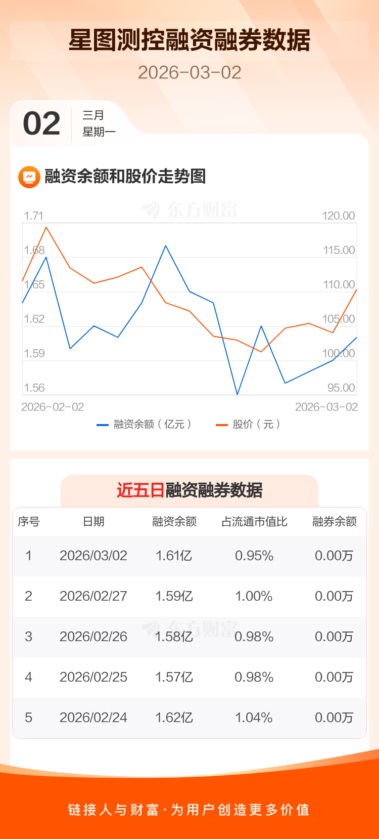 交易所最新数据显示,星图测控于2026年3月2日获融资买入3510.32万元,融资偿还3297.82万元,当日融资净买入212.49万元。目前,该股融资余额1.61亿,占流通市值比例为0.95%。