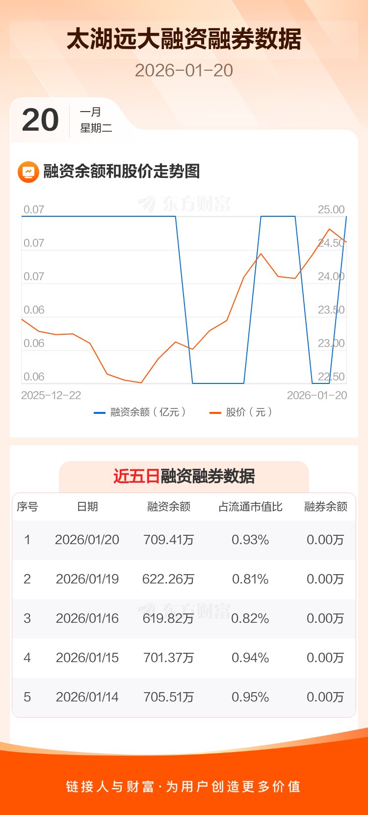 交易所最新数据显示,太湖远大于2026年1月20日获融资买入183.89万元,融资偿还96.74万元,当日融资净买入87.15万元。目前,该股融资余额709.41万,占流通市值比例为0.93%。