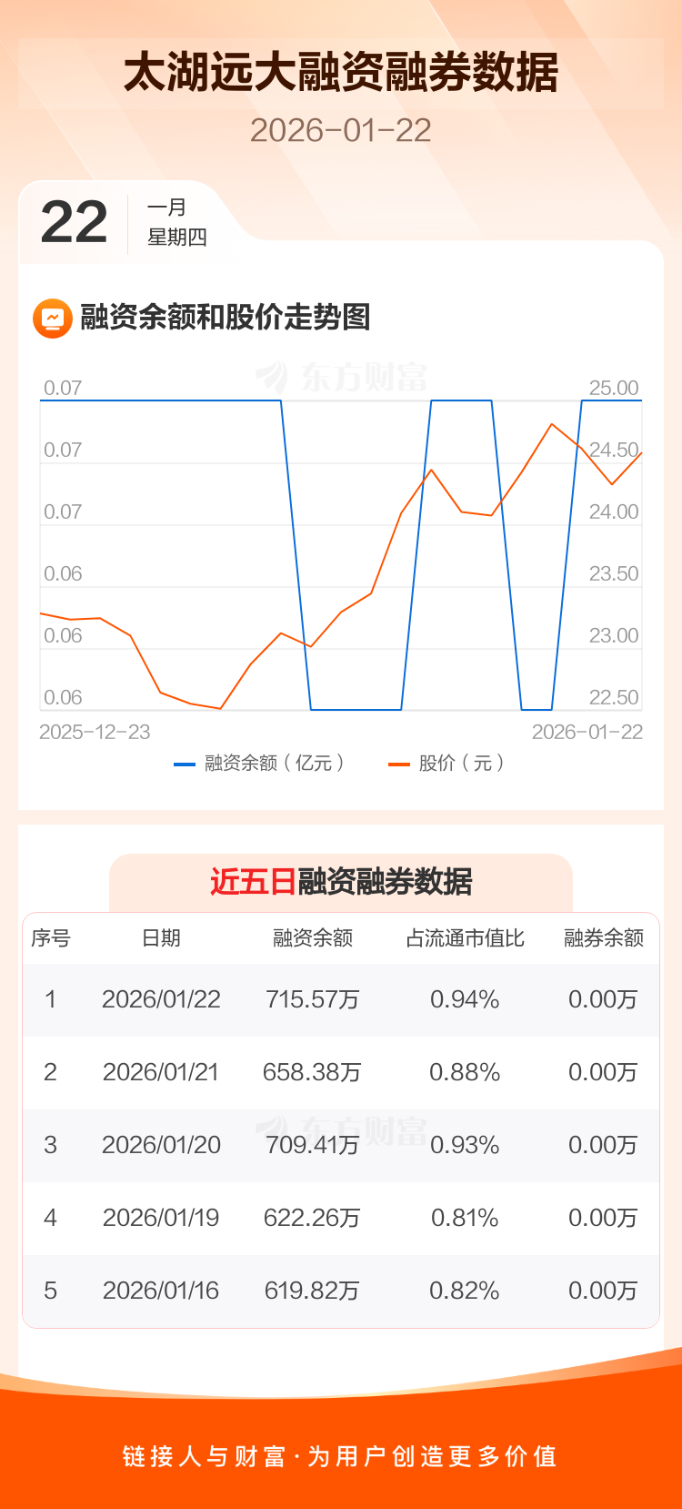 交易所最新数据显示,太湖远大于2026年1月22日获融资买入79.46万元,融资偿还22.27万元,当日融资净买入57.19万元。目前,该股融资余额715.57万,占流通市值比例为0.94%。