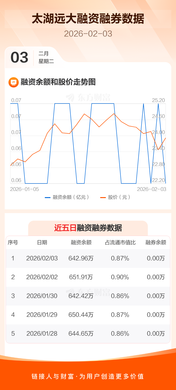 交易所最新数据显示,太湖远大于2026年2月3日获融资买入17.61万元,融资偿还26.56万元,当日融资净偿还8.95万元。目前,该股融资余额642.96万,占流通市值比例为0.87%。