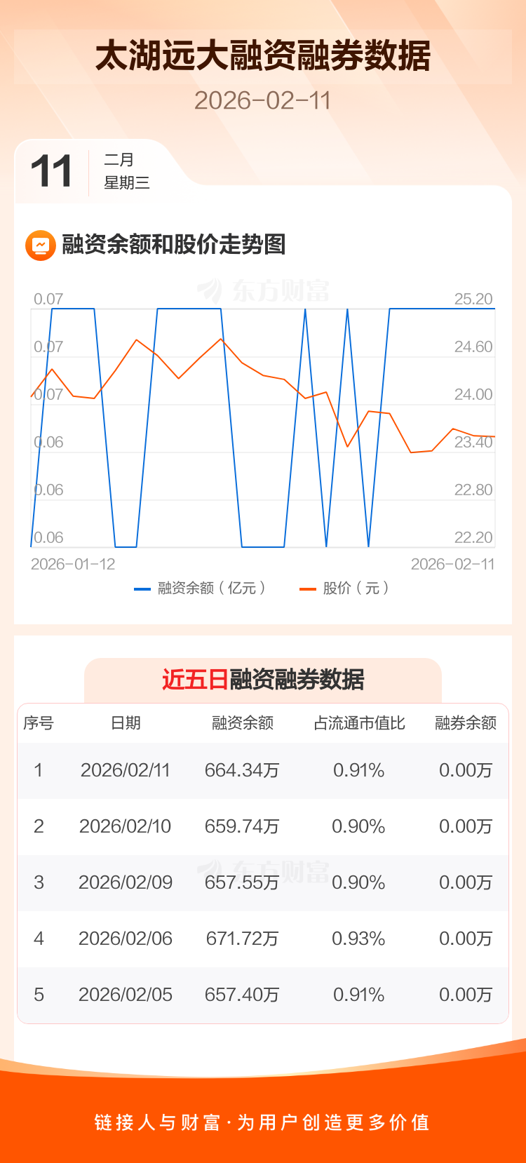 交易所最新数据显示,太湖远大于2026年2月11日获融资买入8.27万元,融资偿还3.66万元,当日融资净买入4.61万元。目前,该股融资余额664.34万,占流通市值比例为0.91%。