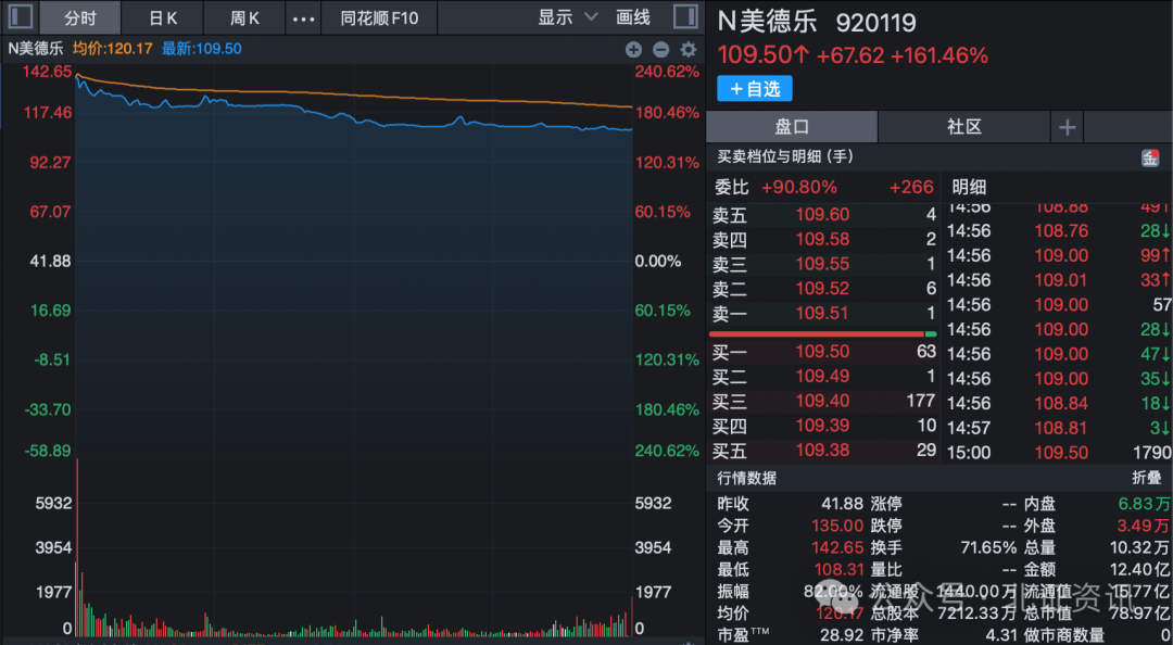 1月30日,美德乐(920119)正式登陆北交所,保荐机构为国泰海通证券。作为网上冻结资金首次突破1万亿元的北交所新股,美德乐上市首日表现亮眼,收盘较发行价大涨161.46%报109.50元/股,总市值为78.98亿元。