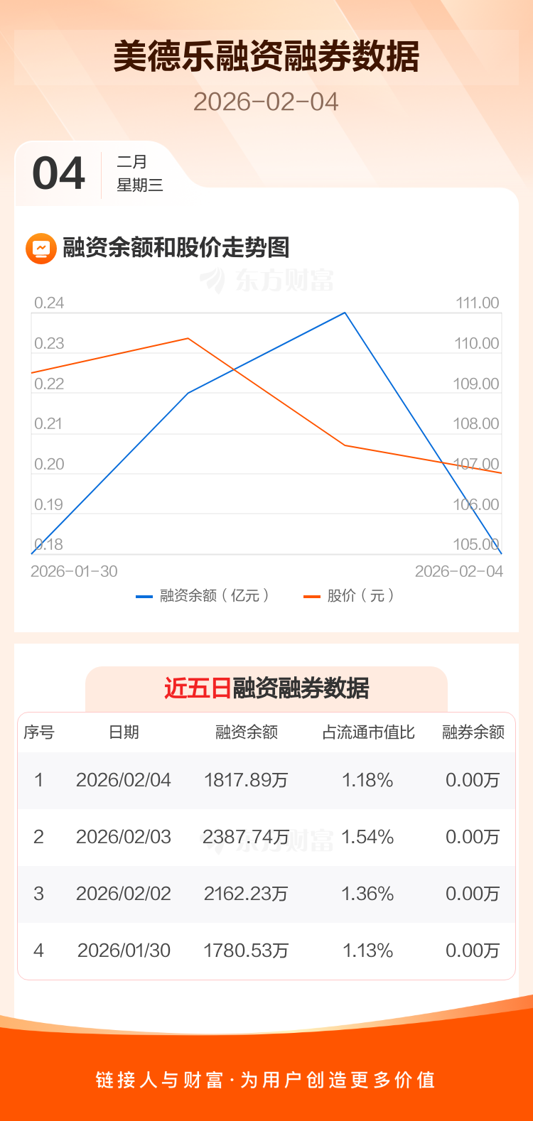 交易所最新数据显示,美德乐于2026年2月4日获融资买入212.26万元,融资偿还782.11万元,当日融资净偿还569.85万元。目前,该股融资余额1817.89万,占流通市值比例为1.18%。