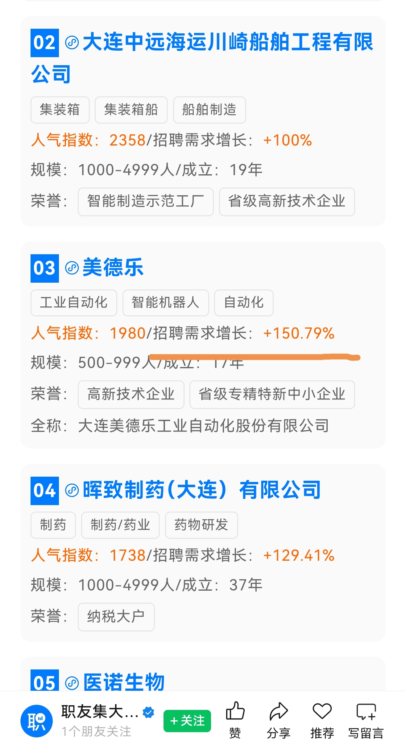 刚发的大连开发区人力需求排行。订单大幅增加,人力需求旺盛。