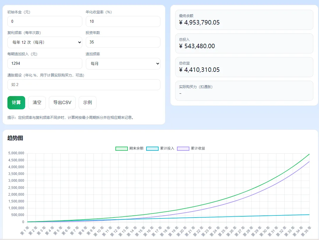 我们假设定投35年(30岁-65岁),定投期间的年化收益率为10%,其后积累的资金全部转为稳健分红产品,每年股息率4%,不再考虑市值增长。