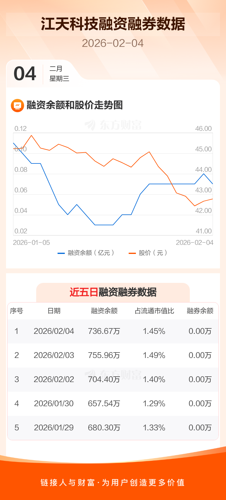 交易所最新数据显示,江天科技于2026年2月4日获融资买入35.85万元,融资偿还55.13万元,当日融资净偿还19.28万元。目前,该股融资余额736.67万,占流通市值比例为1.45%。