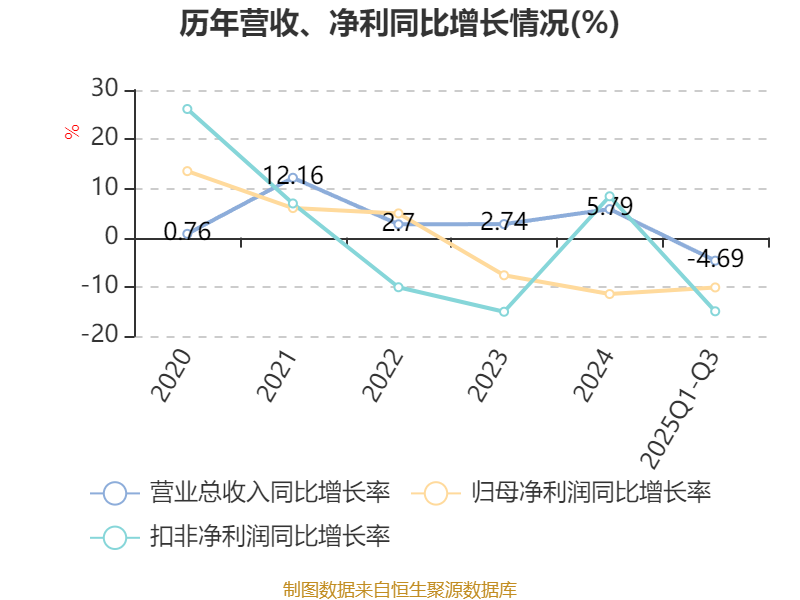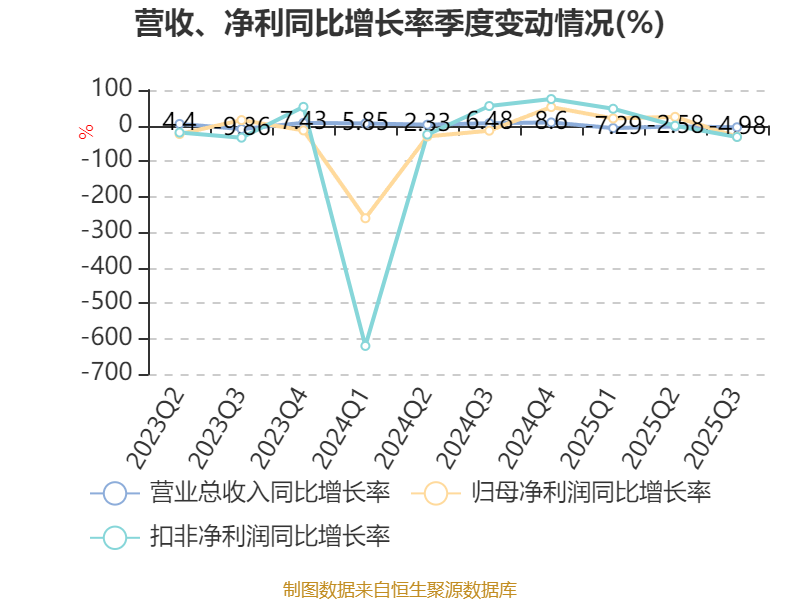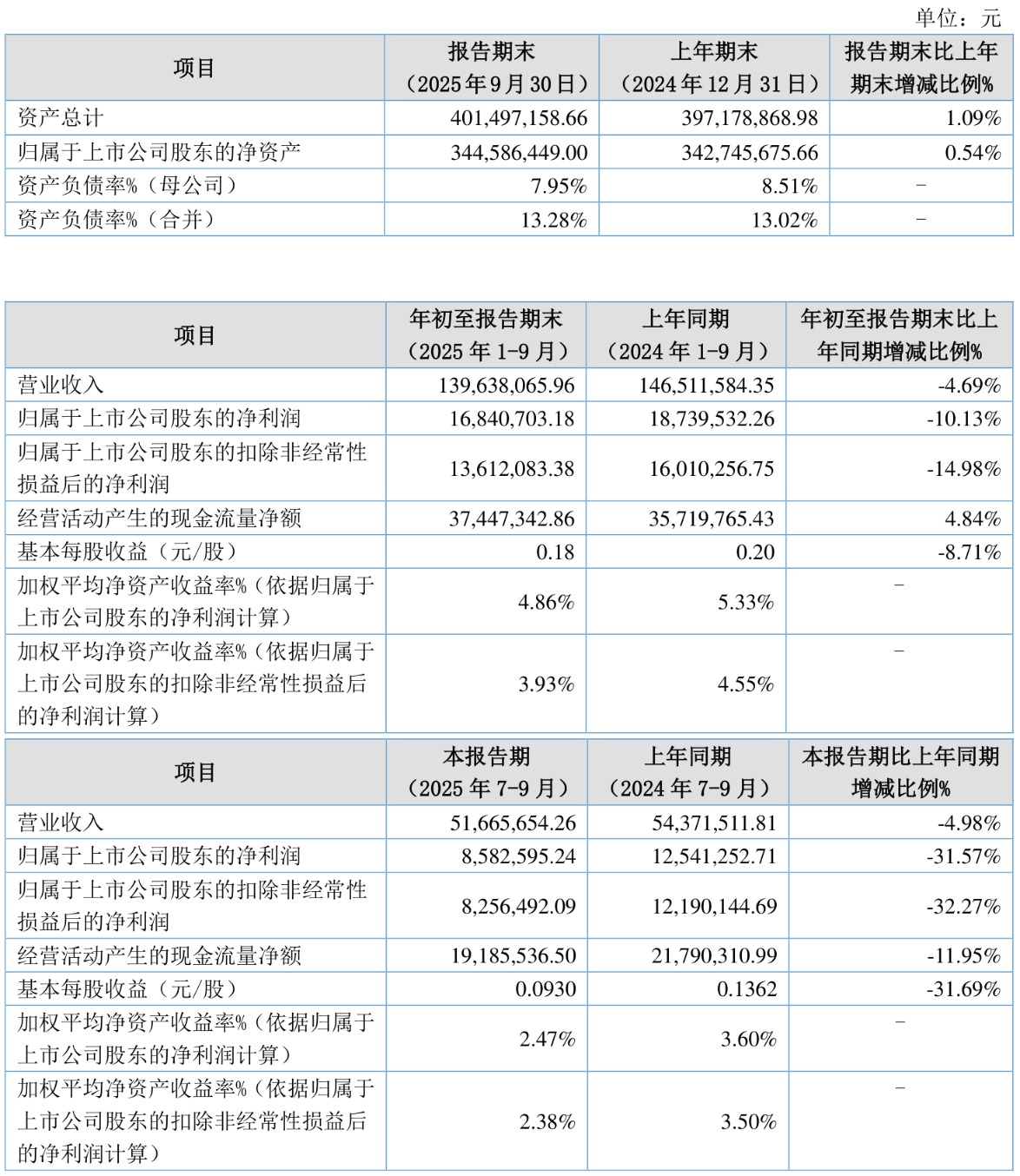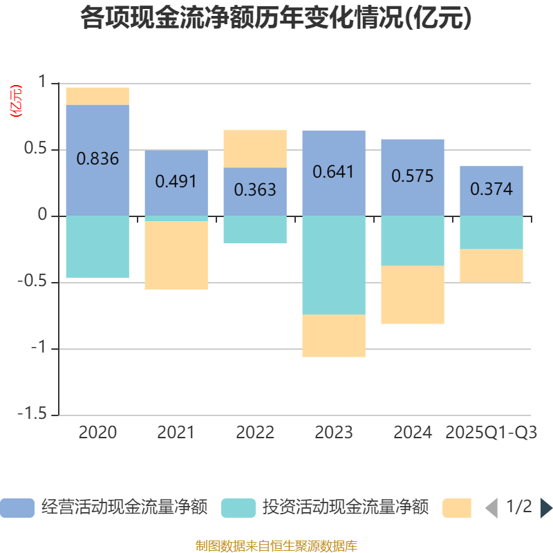 2025年前三季度,公司经营活动现金流净额为3744.73万元,同比增长4.84%;筹资活动现金流净额-2498.68万元,同比增加348.79万元;投资活动现金流净额-2531.71万元,上年同期为-2828.21万元。