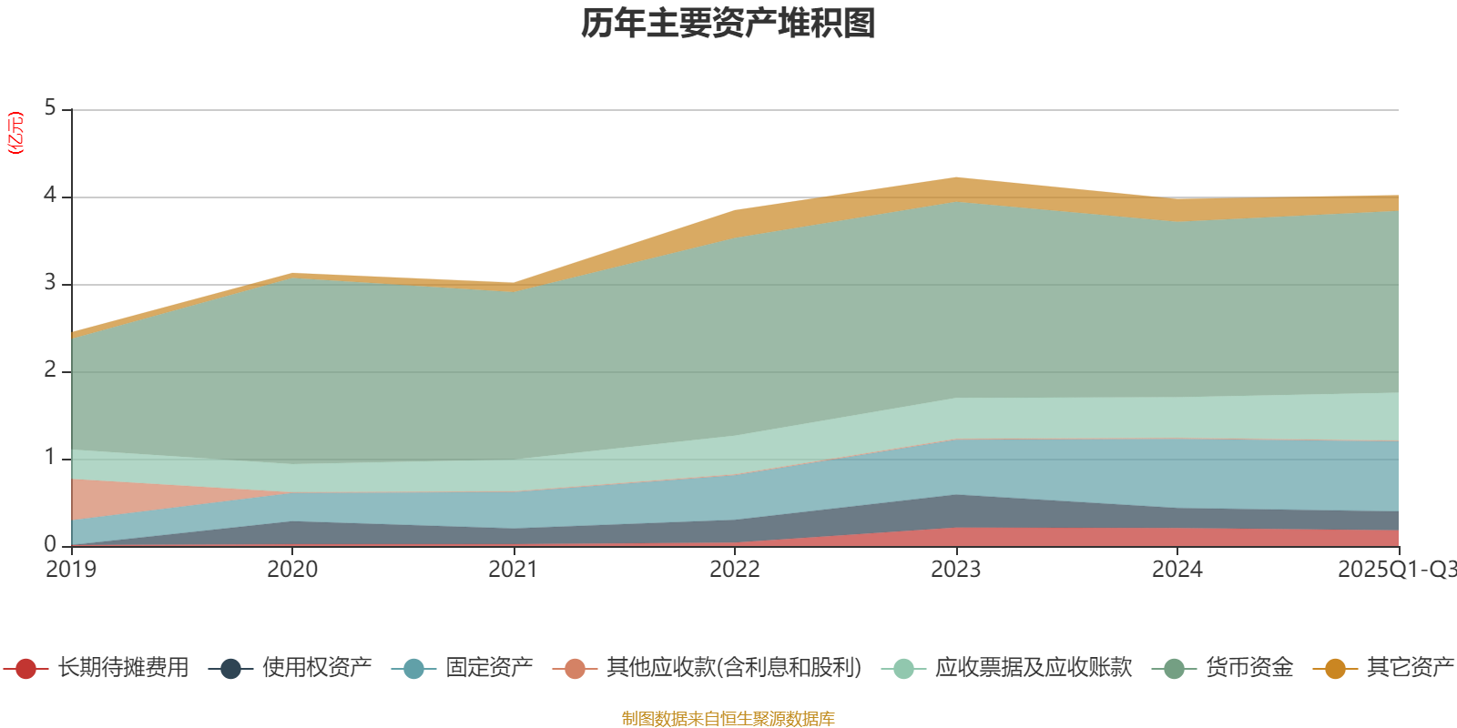 资产重大变化方面,截至2025年三季度末,公司应收票据及应收账款较上年末增加18.16%,占公司总资产比重上升1.98个百分点;货币资金较上年末增加3.51%,占公司总资产比重上升1.21个百分点;在建工程合计较上年末减少100%,占公司总资产比重下降0.84个百分点;长期待摊费用较上年末减少13.15%,占公司总资产比重下降0.73个百分点。