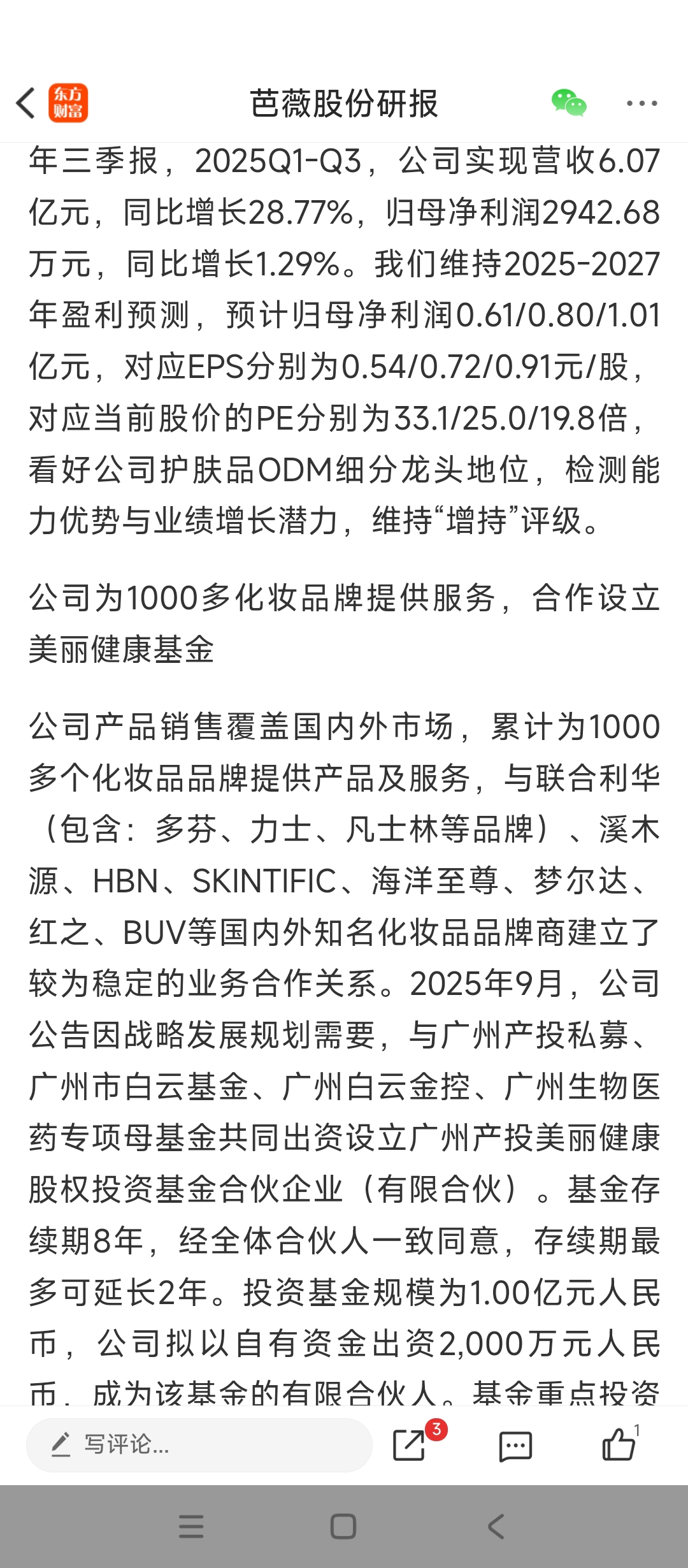 $芭薇股份(SZ920123)$ 合成生物+化妆品+医美+消费,从26.99跌至14.7元,底部启动突破5/10/20/30日线。2025三季报每股收益0.26元,预计2025-27每股收益0.54/0.72/0.91元