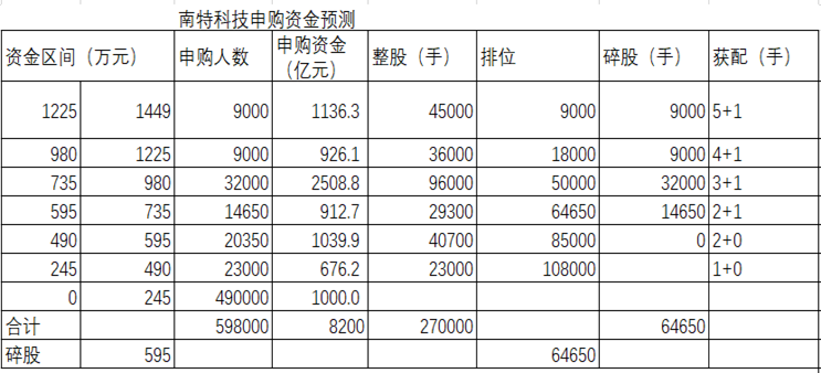 南特科技申购资金预测