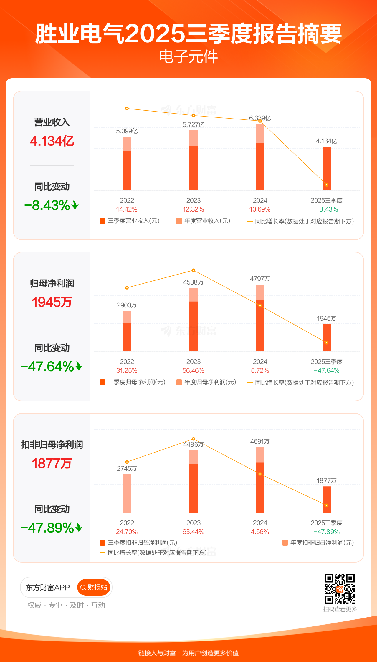 胜业电气10月30日发布2025年三季报显示,公司前三季实现营业收入4.13亿元,同比下滑8.43%;归母净利润1944.69万元,同比下滑47.64%;扣非归母净利润1877.14万元,同比下滑47.89%。
