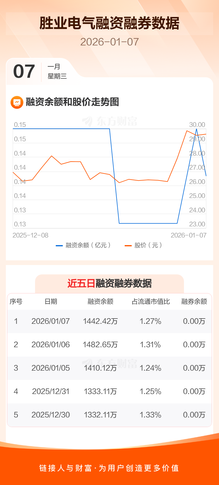 交易所最新数据显示,胜业电气于2026年1月7日获融资买入353.66万元,融资偿还393.89万元,当日融资净偿还40.23万元。目前,该股融资余额1442.42万,占流通市值比例为1.27%。