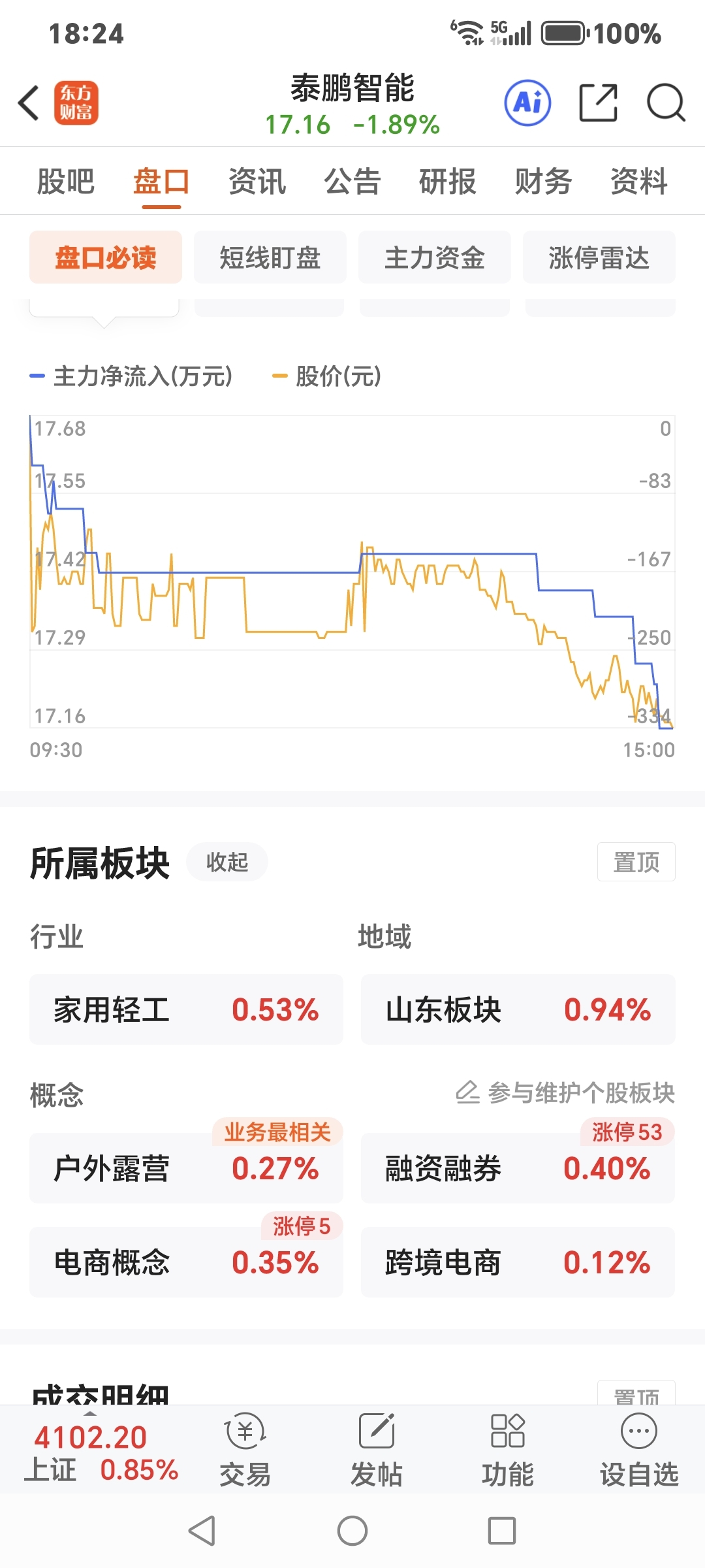$泰鹏智能(SZ920132)$ 今天大盘中阳站上4100点,板块都是上涨的。泰鹏逆大盘大跌,明天能否阳包阴?